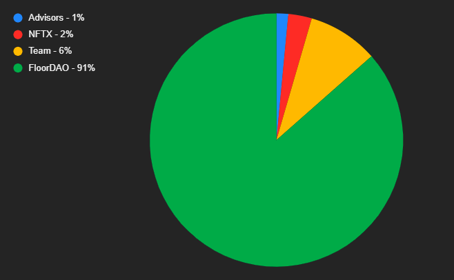 Floor was funded via a short-term loan from NFTX, as a result there has been no need for investors or a private sale as shown in the token distribution below.